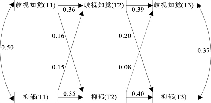 变量 歧视知觉(T1) 抑郁(T1) 孤独感(T1) 歧视知觉(T2) 抑郁(T2) 孤独感(T2) 歧视知觉(T3) 抑郁(T3) 抑郁(T1) 0.50 孤独感(T1) 0.55 0.58 歧视知觉(T2) 0.43 0.31 0.30 抑郁(T2) 0.32 0.44 0.33 0.47 孤独感(T2) 0.23 0.30 0.37 0.40 0.52 歧视知觉(T3) 0.34 0.35 0.36 0.41 0.28 0.26 抑郁(T3) 0.29 0.40 0.36 0.40 0.50 0.03 0.48 孤独感(T3) 0.27 0.28 0.44 0.35 0.30 0.35 0.52 0.57 注:P值均 < 0.01。 -