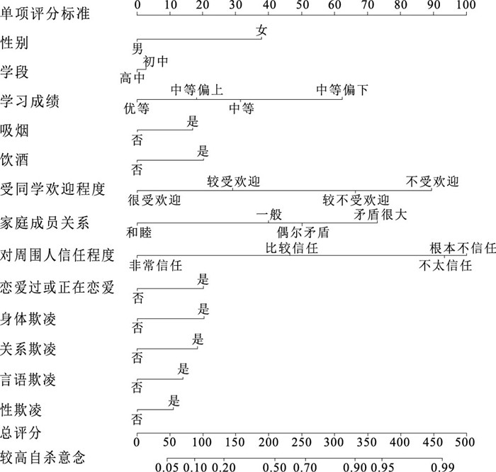 目的 了解宜兴市中学生自杀意念现状并探讨其影响因素,为早期针对性地干预青少年自杀意念提供科学指导。 方法 2019年3—5月,采用分层整群随机抽样法对江苏宜兴3所初中和4所高中的12 799名学生进行问卷调查。使用潜在剖面分析对中学生自杀意念进行分类,并采用χ2检验比较自杀意念潜在类别在不同特征中学生组间差异,采用多元Logistic回归进行影响因素分析,构建列线图预测模型并验证。 结果 中学生自杀意念程度分为无或轻、中、重3类,其中中度自杀意念3 034名(23.7%)、重度753名(5.9%)。多元Logistic回归分析结果显示,性别为女生、学习成绩中等偏下、吸烟、饮酒、受同学欢迎程度(较不受欢迎和不受欢迎)、家庭成员关系(一般/偶有矛盾/矛盾很大)、对周围人信任程度(比较信任/不太信任/根本不信任)、恋爱过或正在恋爱、身体欺凌、关系欺凌、言语欺凌和性欺凌的中学生重度自杀意念发生风险更高(OR值分别为3.27;2.18;1.63;1.72;2.66,6.05;3.00,3.29,6.38;1.71,6.04,12.48;2.50;1.59;2.16;1.45;1.63,P值均 < 0.05)。列线图模型显示区分度较好。 结论 中学生自杀意念受多种因素共同影响,家庭与同伴情况、遭受欺凌等均与自杀意念程度有关。建议从改善学生的家庭与人际关系、控制欺凌等方面入手,减少学生自杀意念。 Abstract:Objective To understand current situation epidemiology and associated factors of suicidal ideation among high school students in Yixing, so as to provide basis for targeted intervention. Methods From March to May 2019, a questionnaire survey was conducted on 12 799 students from 3 junior high schools and 4 senior high schools in Yixing City, Jiangsu Province, using a stratified cluster random sampling method. Latent profile analysis was used to classify suicidal ideation among high school students, the chi-square test was used to compare the differences in suicidal ideation among different characteristics of students, multiple Logistic regression was used to analyze influencing factors, a risk predictive nomogram model was constructed and then verified. Results Three latent classes of suicidal ideation among high school students was divided into three categories were observed: none or mild, moderate, and severe. Among them, 3 034 (23.7%) had moderate suicidal ideation and 753 (5.9%) had severe suicidal ideation. The Logistic regression results showed that gender was female, academic performance was lower mid-range, smoking, drinking, popularity with classmates(less popular and unpopularity), family member relationships(general/occasional contradictions/contradictions), trust in others(more trusted/less trusted/less trusted at all), past or current relationships, physical bullying, relationship bullying, verbal bullying, and sexual bullying were the influencing factors for severe suicidal ideation among students (OR=3.27;2.18;1.63;1.72;2.66, 6.05;3.00, 3.29, 6.38;1.71, 6.04, 12.48; 2.50; 1.59; 2.16; 1.45; 1.63, P < 0.05). The nomogram prediction model had good discrimination. Conclusions Suicide ideation is influenced by multiple factors. Family and peer situations, as well as being bullied, are all related to the degree the severity of suicidal ideation. Efforts can be made to improve students' family and interpersonal relationships, control bullying, then reduce their suicidal ideation which might help prevent suicide ideation among students. -