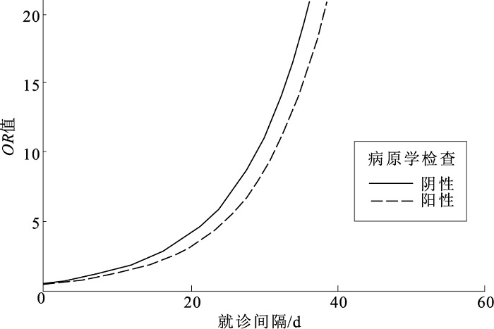 特征 阈值/d 灵敏度/% 特异度/% 阳性预测值/% 阴性预测值/% AUC(95%CI) 就诊间隔 23.5 82.69 88.93 98.28 40.19 0.93(0.89~0.98) 病原学阳性就诊间隔 29.5 77.78 92.86 97.01 58.33 0.92(0.86~0.98) 病原学阴性就诊间隔 15.5 93.75 80.20 99.58 20.27 0.94(0.89~0.99) -