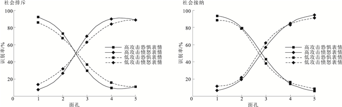 • 图  1  不同组别男工读生恐惧—愤怒连续体识别率