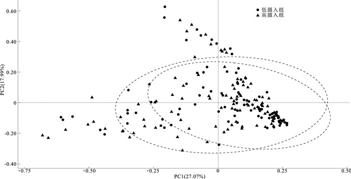 表 1 含糖饮料低摄入组与高摄入组小学生肠道菌群α多样性比较[M(P25, P75)]