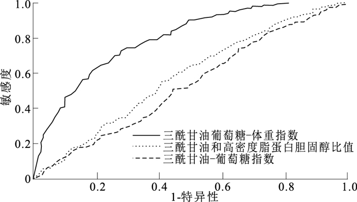 性别 自变量 模型一 模型二 模型三 男生 TyG 0.64(0.43~0.95)* 0.49(0.27~0.89)* 2.20(0.81~5.96) (n=983) TyG-BMI 0.94(0.93~0.95)** 0.93(0.91~0.95)** 1.00(0.97~1.03) TG/HDL-C 0.31(0.17~0.55)** 0.15(0.06~0.40)** 1.55(0.40~6.00) 女生 TyG 1.03(0.59~1.80) 0.89(0.45~1.80) 4.95(1.29~18.95)* (n=611) TyG-BMI 0.96(0.94~0.97)** 0.96(0.94~0.97)** 1.02(0.99~1.06) TG/HDL-C 0.59(0.31~1.13) 0.62(0.27~1.42) 4.38(1.04~18.50)* 总体 TyG 0.74(0.54~1.03) 0.63(0.40~0.98)* 2.19(1.10~4.40)* (n=1 594) TyG-BMI 0.95(0.94~0.95)** 0.94(0.93~0.96)** 1.00(0.98~1.02) TG/HDL-C 0.40(0.26~0.62)** 0.31(0.17~0.58)** 2.34(1.03~5.31)* 注:模型一未调整变量;模型二调整性别、年龄、吸烟、饮酒、高血压家族史、SBP、DBP;模型三在模型二的基础上调整BMI、FM、LM。*P<0.05,**P<0.01。 -