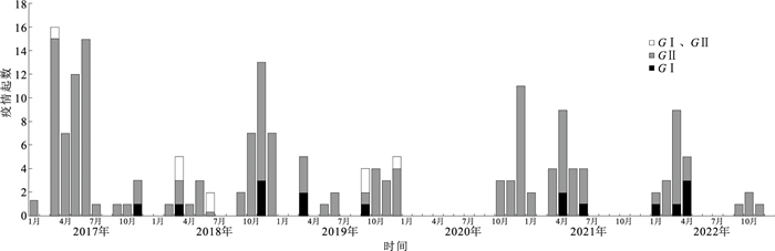 Figure  1.  Time distribution of norovirus outbreaks in primary and secondary schools and kindergartens in Xicheng District of Beijing from 2017 to 2022