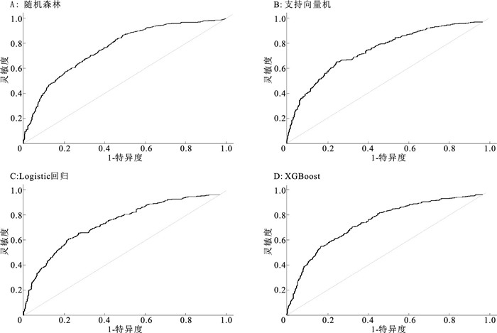 模型 测试集AUC 灵敏度 特异度 阳性预测值 阴性预测值 F1指数 随机森林 0.76 0.62 0.74 0.56 0.79 0.59 支持向量机 0.76 0.61 0.78 0.59 0.79 0.60 Logistic回归 0.76 0.62 0.78 0.60 0.80 0.61 XGBoost 0.77 0.61 0.78 0.59 0.79 0.60 -