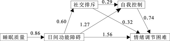 模型 估计值(95%CI) 标准差 Z值 睡眠质量→日间功能障碍→情绪调节困难 1.34(0.81~1.93)* 0.28 4.71 睡眠质量→社会排斥→情绪调节困难 0.23(0.02~0.49)* 0.13 1.84 睡眠质量→自我控制→情绪调节困难 0.35(-0.15~0.85) 0.26 1.36 睡眠质量→日间功能障碍→社会排斥→情绪调节困难 0.17(0.06~0.31)* 0.07 2.51 睡眠质量→日间功能障碍→自我控制→情绪调节困难 0.81(0.54~1.11)* 0.15 5.48 睡眠质量→社会排斥→自我控制→情绪调节困难 0.15(0.01~0.31)* 0.08 1.93 睡眠质量→日间功能障碍→社会排斥→自我控制→情绪调节困难 0.11(0.04~0.20)* 0.04 2.80 直接效应 0.69(-0.42~1.89) 0.59 1.17 总效应 3.85(2.64~5.13)* -0.63 6.12 注: * P < 0.05。 -