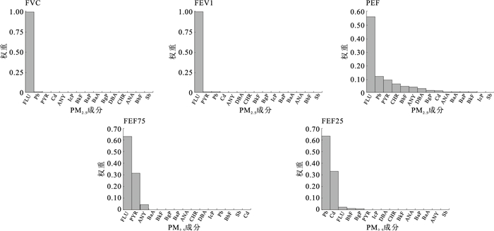 目的 分析细颗粒物(PM2.5)成分的混合暴露对小学生肺功能的急性影响,为保护儿童呼吸健康提供科学依据。 方法 2019—2021年,在天津市分层随机方法选取2 120名小学三至五年级学生进行肺功能测试。同时,结合PM2.5成分和学生住址,模拟短期暴露水平,并采用广义线性回归模型(GLM)和加权分数之和(WQS)回归模型分析PM2.5混合暴露对小学生肺功能的急性影响。 结果 2019—2021年天津市空气中PM2.5日均水平的平均值为81.14 μg/m3,高于国家标准。肺功能检测结果显示,天津市不同地区小学生的用力肺活量(FVC)、第1秒用力呼气量(FEV1)、最大呼气流量(PEF)、75%的用力呼气量(FEF75)和25%的用力呼气量(FEF25)等肺功能测量指标差异均无统计学意义(F值分别为1.23,0.87,2.34,1.56,0.98,P值均>0.05)。但GLM分析结果显示,空气中PM2.5各成分均对小学生的肺功能指标产生不利影响;当芴和芘的成分质量浓度每增加10 ng/m3时,小学生的肺功能FVC指标会分别降低166.44和61.94 L。WQS回归模型分析结果显示,在混合暴露对小学生肺功能指标的影响中,多环芳烃中的芴、芘以及重金属铅所占的比例权重较大。 结论 空气中PM2.5各成分的单一暴露和混合暴露均对小学生的肺功能指标产生不利影响,其中多环芳烃中的芴和芘以及重金属铅的影响尤为显著。应采取综合防治措施对可能的污染来源进行加强控制,以保护小学生的呼吸系统健康。 Abstract:Objective To analyze the acute effects of exposure to fine particulate matter (PM2.5) components on primary school students' lung function, so as to provide a scientific basis for protecting children's respiratory health. Methods From 2019 to 2021, the study selected a total of 2 120 primary school students from grades 3 to 5 in Tianjin using a stratified random sampling method to undergo lung function tests. At the same time, the short-term exposure levels were simulated by combining PM2.5 components and student addresses, and the acute impact of PM2.5 exposure on primary school students' lung function was analyzed by generalized linear models (GLM) and weighted quantile sum (WQS) regression models. Results The average daily concentration of PM2.5 in the air of Tianjin from 2019 to 2021 was 81.14 μg/m3, which was higher than the national standard. The results of lung function testing showed that there was no statistically significant difference in lung function measurement indicators such as forced vital capacity (FVC), forced expiratory volume at 1 second (FEV1), peak expiratory flow (PEF), 75% forced expiratory volume in 75 (FEF75), and 25% forced expiratory volume in 25 (FEF25) among primary school students in different regions of Tianjin (F=1.23, 0.87, 2.34, 1.56, 0.98, P>0.05). But the GLM analysis results showed that all components of PM2.5 in the air had adverse effects on the lung function indicators of primary school students. When the concentrations of fluorene (FLU) and pyrene (PYR) increased by 10 ng/m3, the FVC of primary school students decreased by 166.44 and 61.94 L respectively. The WQS regression model analysis results showed that the mixed exposure of PM2.5 components particularly significant damaging effects on lung function indicators in primary school students, especially the FLU and PYR components in polycyclic aromatic hydrocarbons, as well as the heavy metal lead. Conclusions Both single and mixed exposure to various PM2.5 components in the air have adverse effects on the lung function of primary school students. Among them, the influences of FLU and PYR in polycyclic aromatic hydrocarbons, as well as heavy metal Pb, are particularly significant.Potential pollution sources should be controlled to protect the respiratory health of primary school students by comprehensive prevention and control measures. -