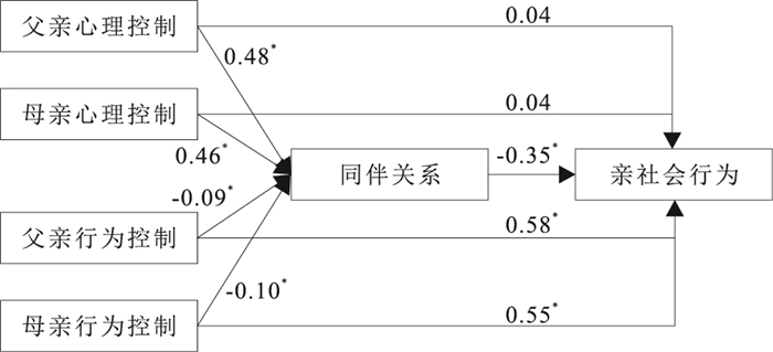 结果变量 预测变量 B值(95%CI) t值 亲社会行为 父亲心理控制 0.04(-0.06~0.14) 0.85 母亲心理控制 0.04(-0.04~0.14) 1.07 父亲行为控制 0.58(0.53~0.64) 19.48* 母亲行为控制 0.55(0.50~0.61) 19.11* 同伴关系 父亲心理控制 0.48(0.42~0.53) 16.67* 母亲心理控制 0.46(0.40~0.51) 17.29* 父亲行为控制 -0.09(-0.12~-0.05) -4.38* 母亲行为控制 -0.10(-0.14~-0.06) -5.33* 亲社会行为c' 父亲心理控制 0.20(0.11~0.31) 4.13* 母亲心理控制 0.20(0.12~0.31) 4.50* 父亲行为控制 0.55(0.50~0.62) 18.94* 母亲行为控制 0.52(0.47~0.58) 18.38* 注: *P < 0.05;c'表示同伴关系进入回归方程后,父母心理和行为控制对亲社会行为的回归系数。 -