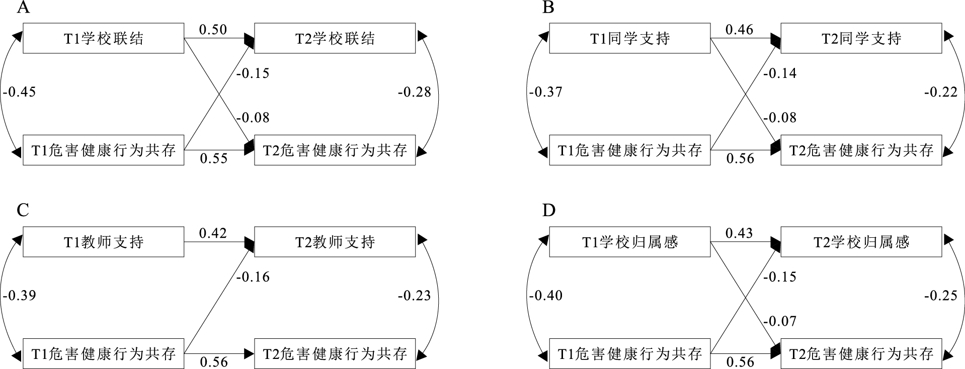 变量 T1学校联结 T1同学支持 T1教师支持 T1学校归属感 T1危害健康行为共存 T2学校联结 T2同学支持 T2教师支持 T2学校归属感 T1同学支持 0.86 T1教师支持 0.80 0.48 T1学校归属感 0.89 0.62 0.68 T1危害健康行为共存 -0.46 -0.38 -0.39 -0.40 T2学校联结 0.56 0.48 0.45 0.49 -0.37 T2同学支持 0.48 0.51 0.31 0.36 -0.31 0.86 T2教师支持 0.47 0.32 0.49 0.44 -0.32 0.81 0.48 T2学校归属感 0.49 0.38 0.39 0.48 -0.33 0.90 0.64 0.69 T2危害健康行为共存 -0.33 -0.28 -0.27 -0.29 0.58 -0.43 -0.36 -0.37 -0.38 注:P值均<0.05。 -