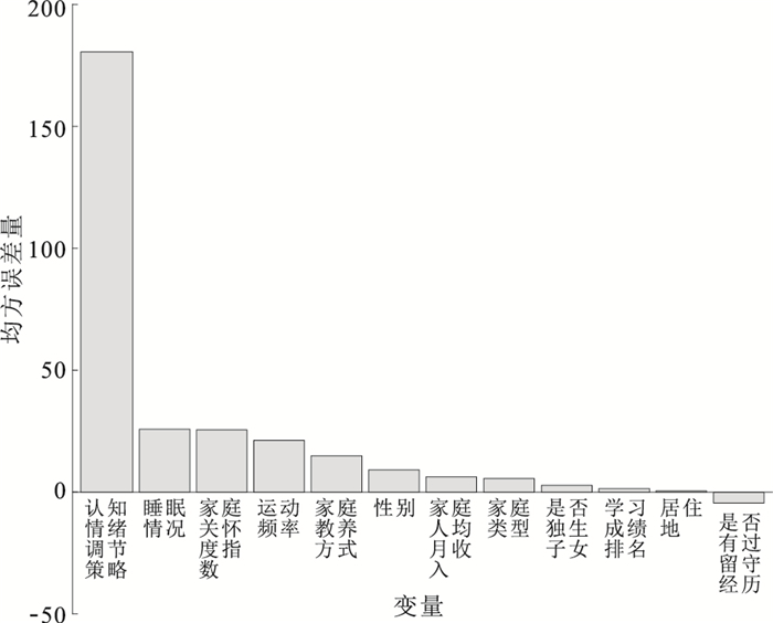 • 摘要:   目的  探讨大学生负面评价恐惧的影响因素,为提高大学生心理健康水平提供实证依据。  方法  2024年3月采用方便抽样方法,从湖北省武汉市某3所大学抽取5 750名大学生,利用简明负面评价恐惧量表、中文版认知情绪调节策略量表、家庭关怀度指数量表和自编一般情况调查表进行线上问卷调查。利用最小二乘法回归模型分析负面评价恐惧的影响因素,同时构建随机森林模型探索负面评价恐惧的影响因素及各变量的重要性排序。  结果  最小二乘法回归模型结果显示,认知情绪调节策略对大学生负面评价恐惧水平的影响有统计学意义,其中相比适应性情绪调节策略组,非适应性情绪调节策略显著影响大学生负面评价恐惧水平(β=4.25,95%CI=3.81~4.68);家庭关怀中轻度障碍(β=-2.71,95%CI=-3.36~-2.06)、重度障碍(β=-1.64,95%CI=-2.27~-1.01)可能增加大学生负面评价恐惧水平(P值均<0.05)。随机森林模型中,根据%IncMSE排序和节点纯度排序,认知情绪调节策略均为影响大学生负面评价恐惧水平的最主要因素。  结论  认知情绪调节策略是影响大学生负面评价恐惧水平的关键因素。高校可采取针对性干预措施,缓解大学生的负面评价恐惧。