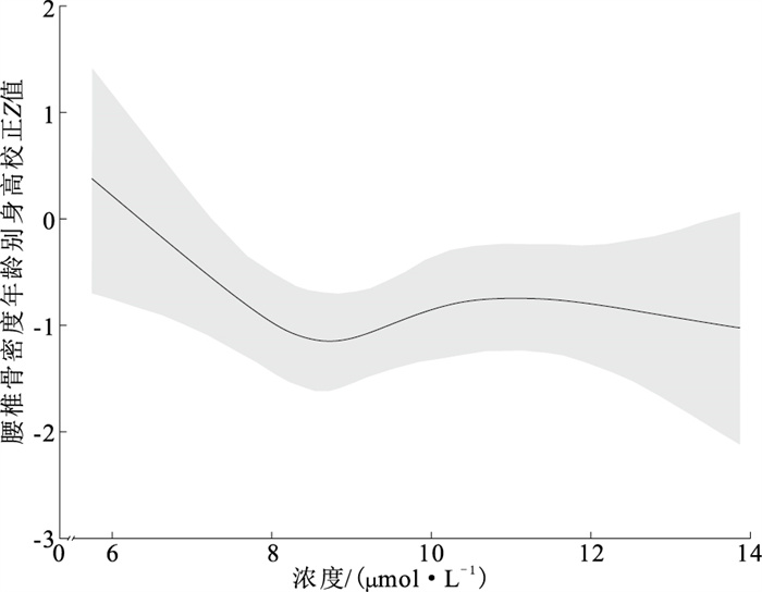• 摘要:   目的  了解脑瘫患儿血清同型半胱氨酸水平和腰椎骨密度(BMD)现况并分析两者的关联性,为改善脑瘫患儿骨健康提供参考。  方法  2023年1月—2024年1月选取G市社会福利院(萝岗院区)的149名10~18岁脑瘫患儿,通过福利院病案系统导出脑瘫患儿基本人口学信息,采用酶循环法测量患儿血清同型半胱氨酸水平,由专业康复医师使用双能X线吸收法对患儿腰椎BMD进行测定,并计算腰椎身高校正BMD Z值(BMD HAZ值)。采用非限制性立方样条和分段多重线性回归分别分析脑瘫患儿血清同型半胱氨酸水平与腰椎BMD HAZ值的关联性。  结果  脑瘫患儿血清同型半胱氨酸浓度中位数为9.13(8.42,10.30)μmol/L,痉挛型脑瘫患儿浓度[9.28(8.53, 10.49)μmol/L]高于非痉挛型[8.64(7.89, 9.66)μmol/L](Z=-2.46,P < 0.05)。腰椎BMD HAZ值中位数为-1.07(-2.10,-0.16),脑瘫患儿低BMD检出率为29.5%。脑瘫患儿血清同型半胱氨酸浓度与腰椎BMD HAZ值呈“L”型关联。当血清同型半胱氨酸浓度≤8.7 μmol/L时,腰椎BMD HAZ值与血清同型半胱氨酸浓度呈负相关(B=-0.32,95%CI=-1.06~-0.15,P < 0.05)。  结论  脑瘫患儿在较低血清同型半胱氨酸浓度下发现与腰椎BMD的负相关,提示其对同型半胱氨酸影响的敏感性可能较健康儿童青少年高,即使未达到高同型半胱氨酸血症标准也应引起重视。