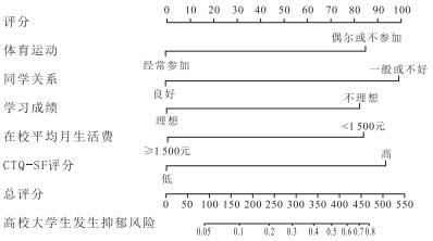 因素 β值 标准误 Wald χ2值 OR值(95%CI) P值 体育运动 1.35 0.42 10.53 3.87(1.70~8.80) <0.01 同学关系 1.57 0.47 11.44 4.82(2.12~10.97) <0.01 学习成绩 1.29 0.51 6.42 3.63(1.60~8.26) <0.01 在校平均月生活费 1.32 0.44 9.10 3.75(1.65~8.52) <0.01 CTQ-SF评分 1.48 0.37 15.81 4.39(1.93~9.98) <0.01 -